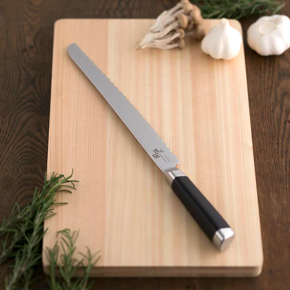 貝印(KAI) SKU: Kitchen Knife (Bread Knife / Serrated), Damascus Steel, 240mm. Material:Multi-layered Damascus Stainless Steel (Blade), Laminated Reinforced Wood (Handle). Brand: KAI (Seki Magoroku). Made in Japan.