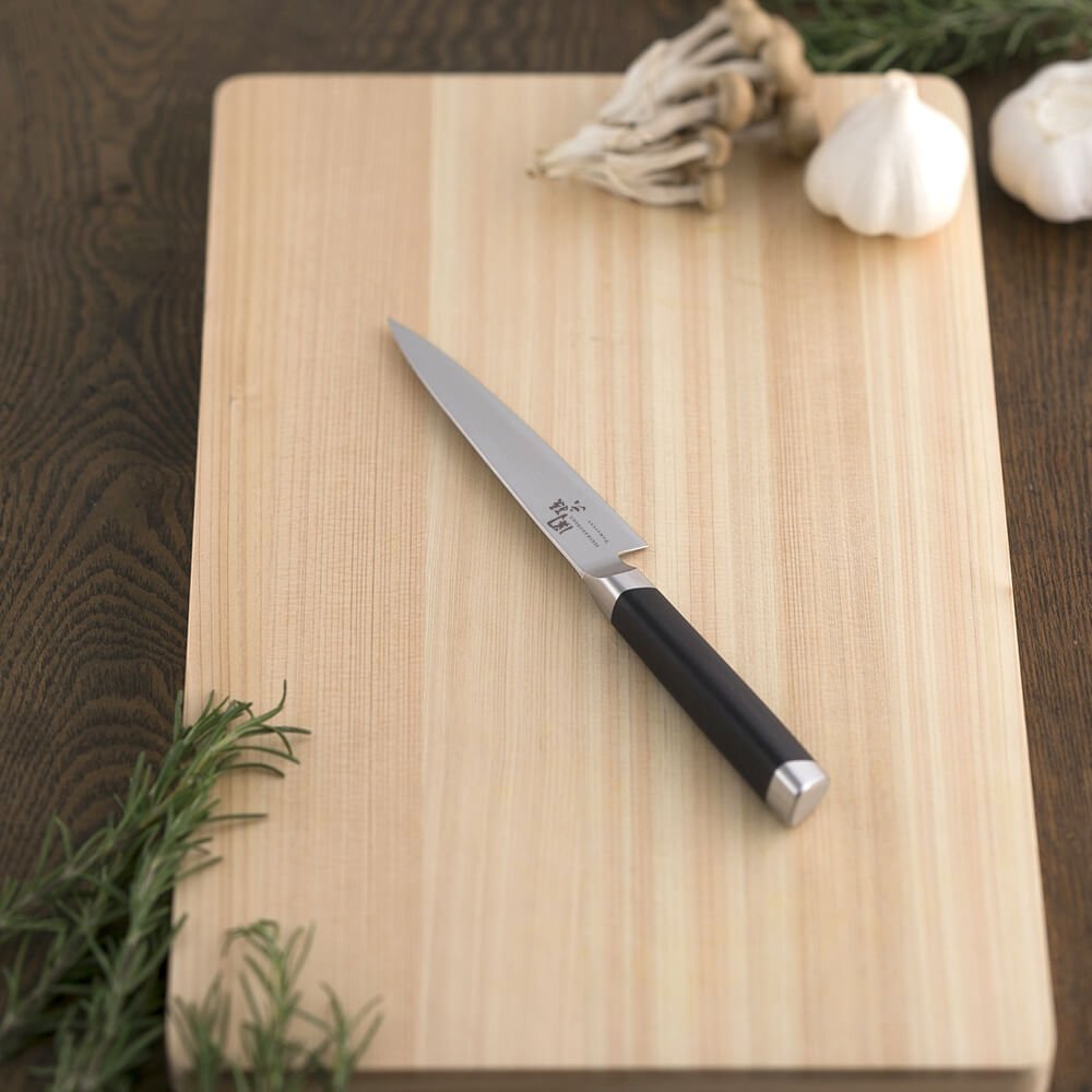 鎌倉時代に九州から現在の岐阜県関市(美濃)に移り住んだ刀鍛冶が、良質の土、水、炭に恵まれたこの地域で、刀剣作りをはじめたのが関鍛冶(Seki-Kaji)の起源です。多くの名刀が生まれましたが、名匠「関の孫六」(Seki-no-Magoroku)は独特の作刀を工夫し、美しく芸術性の高い、切れ味の抜群な最上の業物を世に送り出しました。江戸から明治と時代は変遷し、関の刀匠たちの多くが家庭用刃物の製造へと転業しました。関の刀剣が「折れず曲がらず、よく切れる」と称賛された信念は、現代の刃物作りにもしっかりと受け継がれています。「関孫六」シリーズの銘は27代目兼元、刀匠金子孫六氏によるもので、匠の技を生かしながら、その切れ味を現代に伝えています。