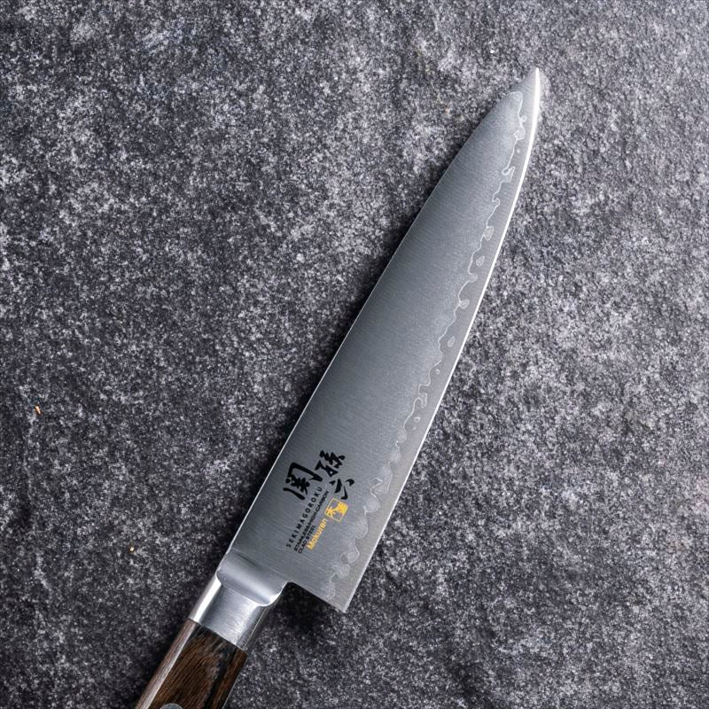 鎌倉時代に九州から現在の岐阜県関市(美濃)に移り住んだ刀鍛冶が、良質の土、水、炭に恵まれたこの地域で、刀剣作りをはじめたのが関鍛冶(Seki-Kaji)の起源です。多くの名刀が生まれましたが、名匠「関の孫六」(Seki-no-Magoroku)は独特の作刀を工夫し、美しく芸術性の高い、切れ味の抜群な最上の業物を世に送り出しました。江戸から明治と時代は変遷し、関の刀匠たちの多くが家庭用刃物の製造へと転業しました。関の刀剣が「折れず曲がらず、よく切れる」と称賛された信念は、現代の刃物作りにもしっかりと受け継がれています。「関孫六」シリーズの銘は27代目兼元、刀匠金子孫六氏によるもので、匠の技を生かしながら、その切れ味を現代に伝えています。