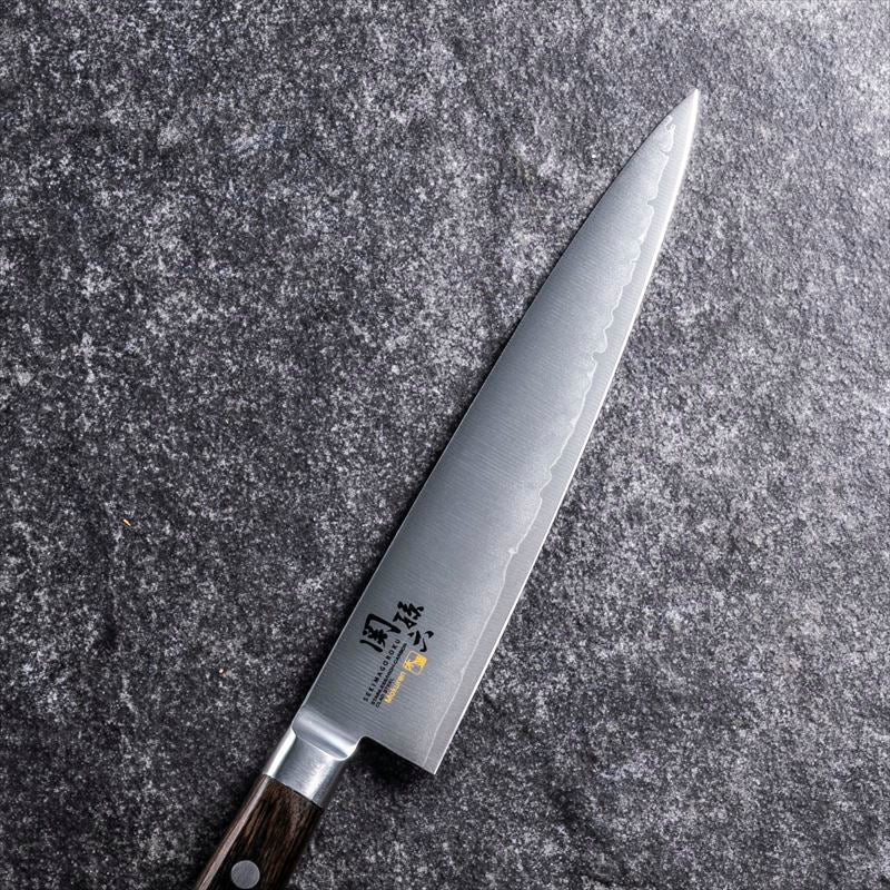鎌倉時代に九州から現在の岐阜県関市(美濃)に移り住んだ刀鍛冶が、良質の土、水、炭に恵まれたこの地域で、刀剣作りをはじめたのが関鍛冶(Seki-Kaji)の起源です。多くの名刀が生まれましたが、名匠「関の孫六」(Seki-no-Magoroku)は独特の作刀を工夫し、美しく芸術性の高い、切れ味の抜群な最上の業物を世に送り出しました。江戸から明治と時代は変遷し、関の刀匠たちの多くが家庭用刃物の製造へと転業しました。関の刀剣が「折れず曲がらず、よく切れる」と称賛された信念は、現代の刃物作りにもしっかりと受け継がれています。「関孫六」シリーズの銘は27代目兼元、刀匠金子孫六氏によるもので、匠の技を生かしながら、その切れ味を現代に伝えています。