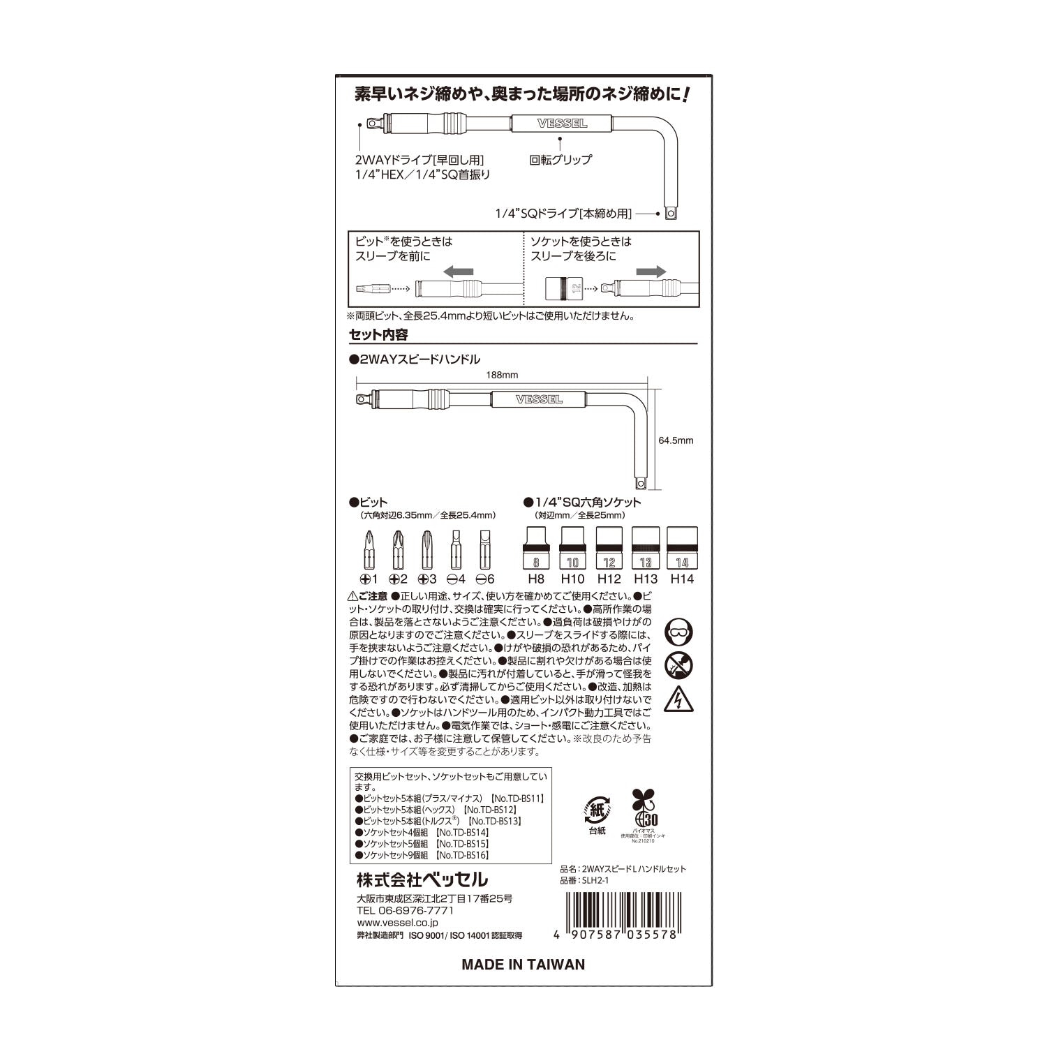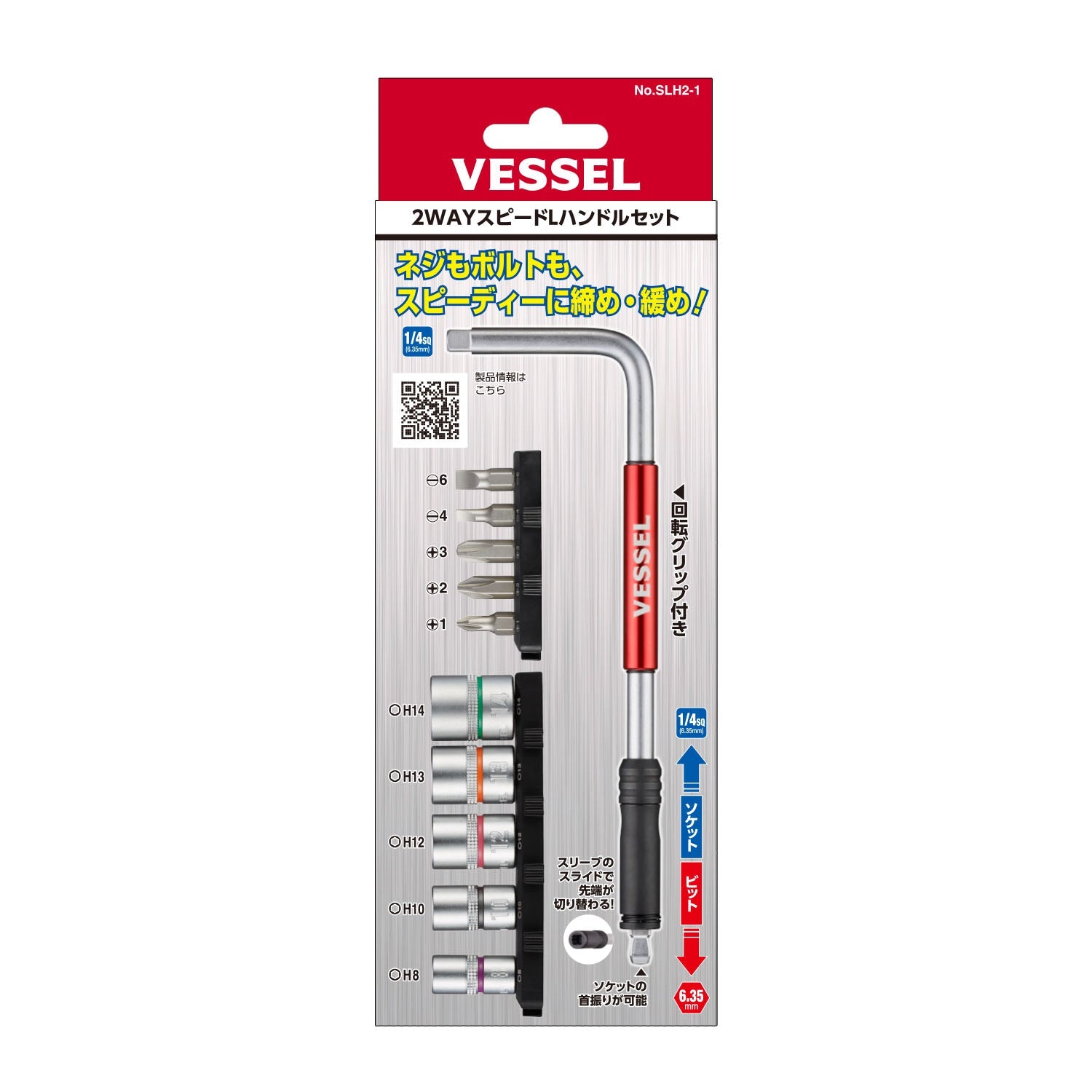 セット内容/付属品: スピードLハンドル(H6.35/SQ1/4)…1、ビット(+)1,(+)2,(+)3,(-)4,(-)6×25.4mm…各1、ソケットH8, 10, 12, 13, 14×25mm…各1、ホルダー…2